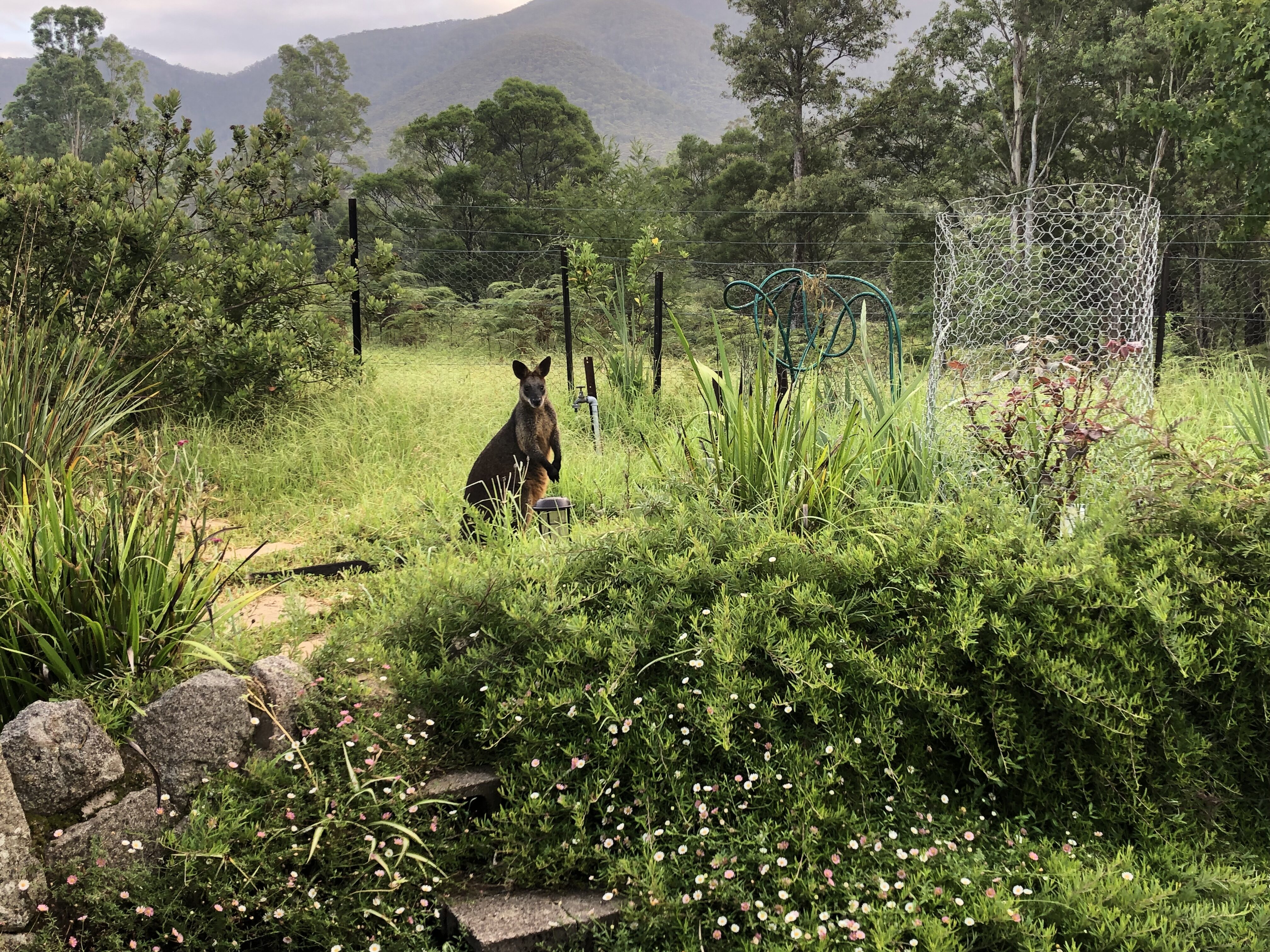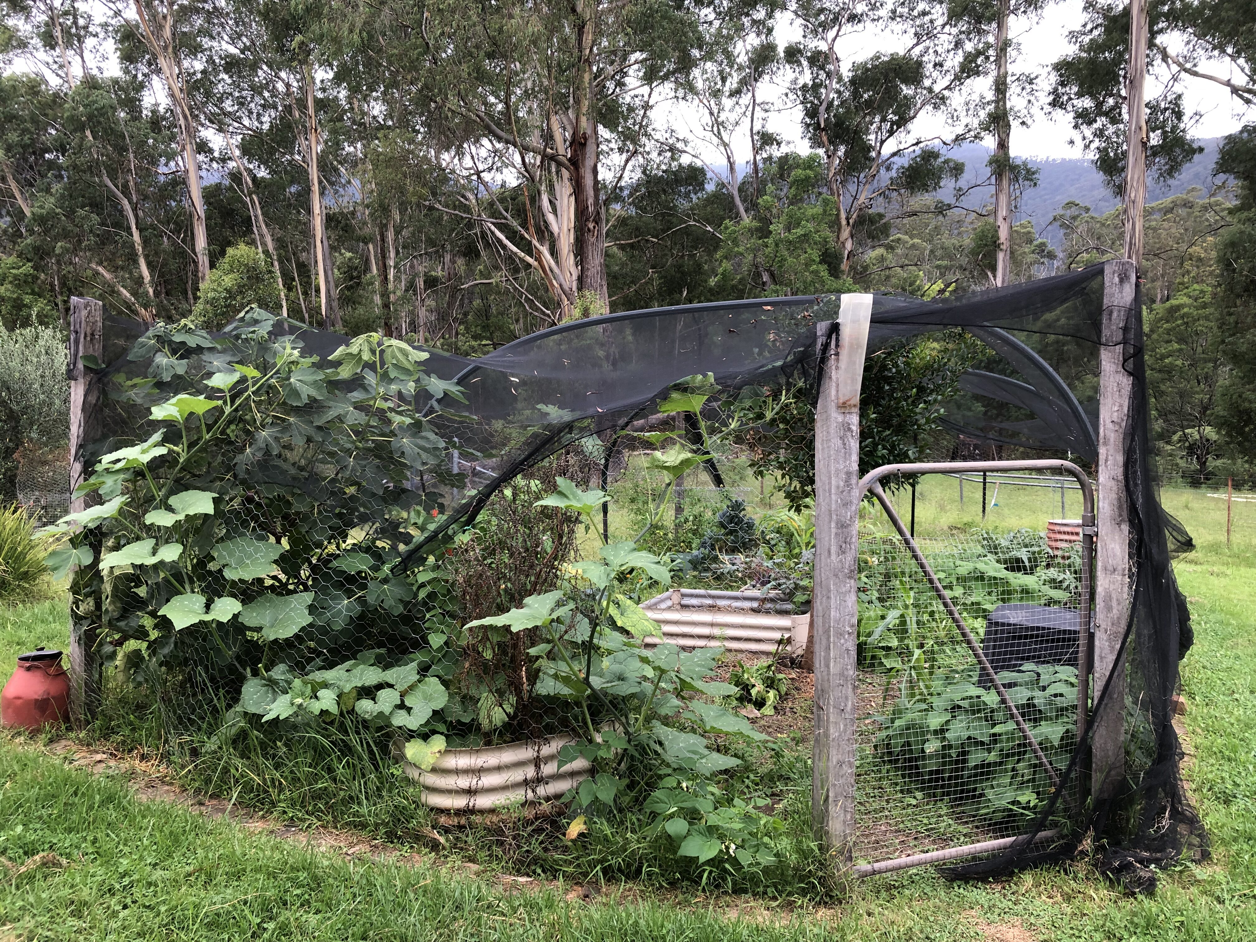 We build our gardens using compost, manure, charcoal from pile burns and Lucerne. We have to cage & net everything from all the wildlife.