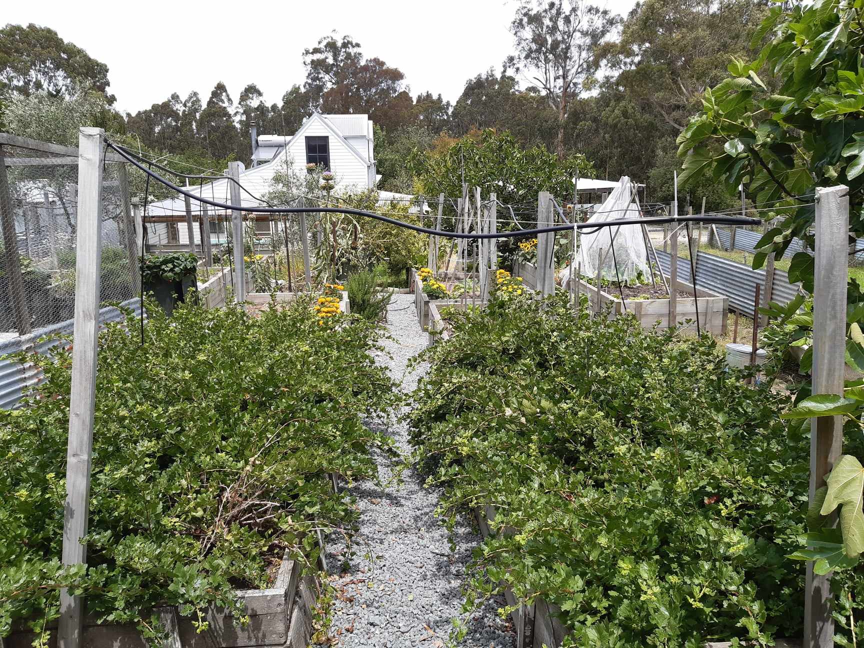 I do not use any particular method for growing fruit and vegetables but avoid use of chemicals. The animals provide a continuous supply of fertiliser and I make my own soil for replenishing the raised garden beds. Weed control is constant and blackberries need to be dug out on a regular basis.